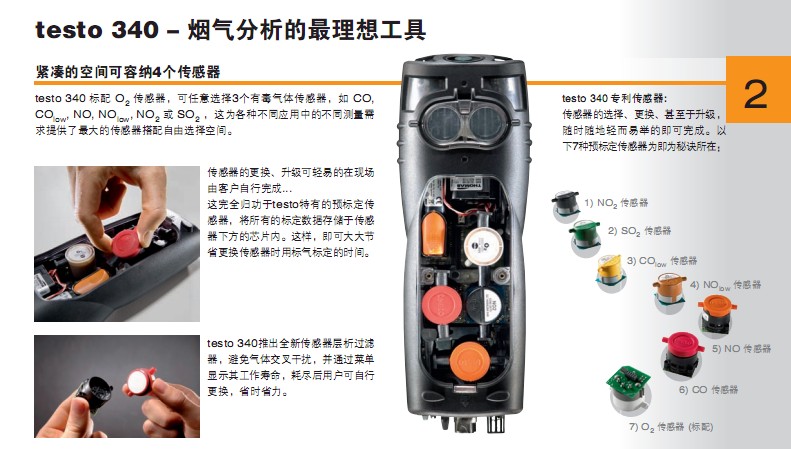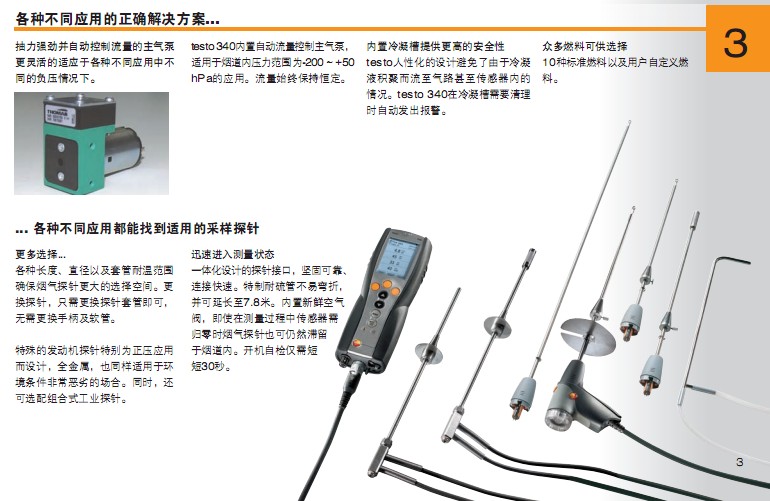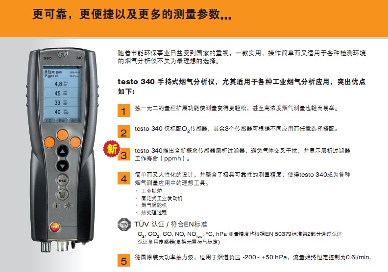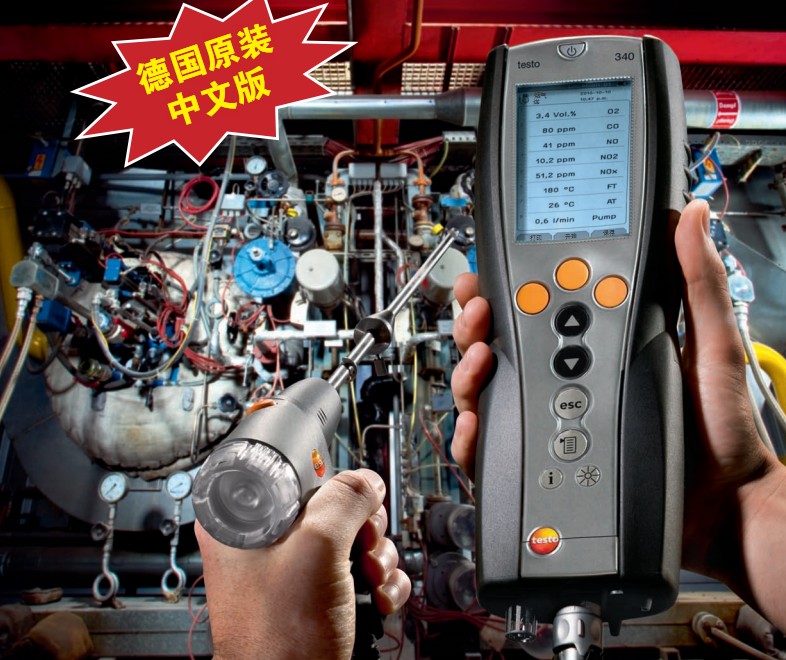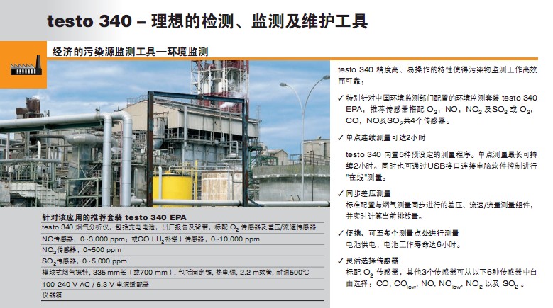 testo 340手持式煙氣分析儀, 包括充電電池,出廠報(bào)告及背帶, 標(biāo)配O2傳感器及差壓/流速傳感器。