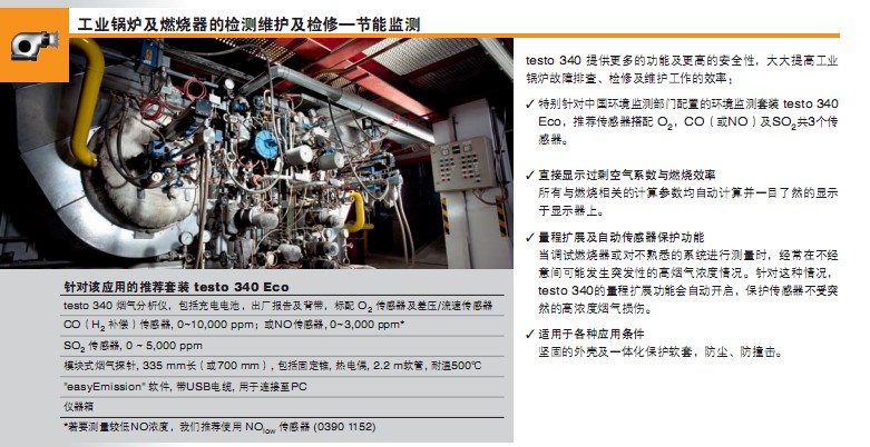 產(chǎn)品介紹:不斷提高的燃料成本,使得利用煙氣分析來(lái)提高鍋爐的燃燒效率變得越來(lái)越重要。一臺(tái)實(shí)用的,操作簡(jiǎn)單而又便攜的煙氣分析儀即為最理想的選擇 testo 340僅標(biāo)配O2傳感器, 其余3個(gè)傳感器可根據(jù)不同應(yīng)用而任意選擇搭配。緊湊的設(shè)計(jì),值得信賴(lài)的技術(shù)使得testo 340可適用于以下各種應(yīng)用中: