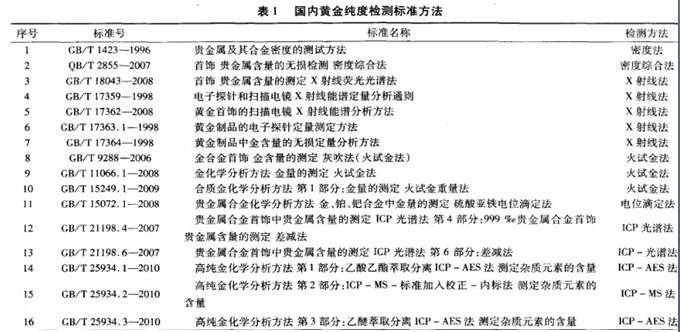 為了保證首飾的硬度、光澤度及美觀程度等,黃金首飾的組成原料不是單一的純金屬,而是以黃金為主要材料的合金體。目前,中國首飾行業(yè)強(qiáng)制性標(biāo)準(zhǔn)08 11887-2008規(guī)定,黃金首飾按黃金純度大致可分為9K、14K、18K、22K、足金和千足金等幾種。對(duì)于各類首飾中金和其他組成元素的分析測(cè)試,目前國內(nèi)均有相應(yīng)的標(biāo)準(zhǔn)分析方法,主要包括國家標(biāo)準(zhǔn)、行業(yè)標(biāo)準(zhǔn)、地方標(biāo)準(zhǔn)等。這些分析方法為黃金首飾的公平交易以及相關(guān)部門的質(zhì)量監(jiān)督,提供了必要的技術(shù)支持。按照分析測(cè)試方法的原理和性質(zhì),可將這些方法大致劃分為密度法、X射線法、火試金法、重量法、電感耦合等離子體原子發(fā)射光譜法等。